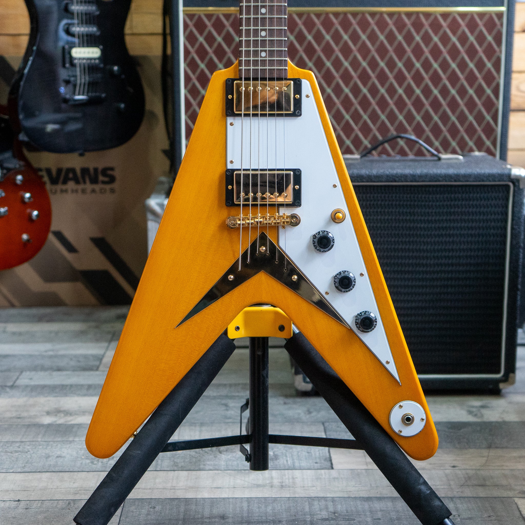 A near immaculate example of the Epiphone 1958 Korina Flying V in Natural, with its gorgeous matching hardcase.